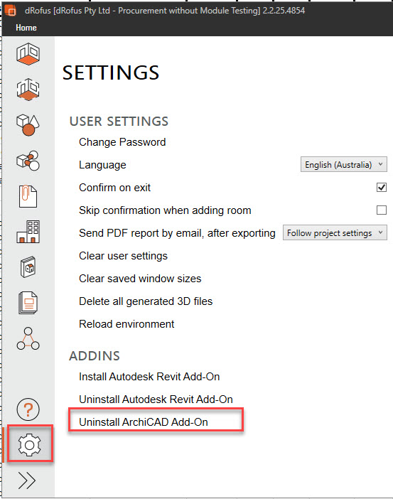 次に、dRofus クライアントで設定 (Setting)->アドイン (Add-in )->ArchiCAD アドオンのアンインストール (Uninstall ArchiCAD Add-On )